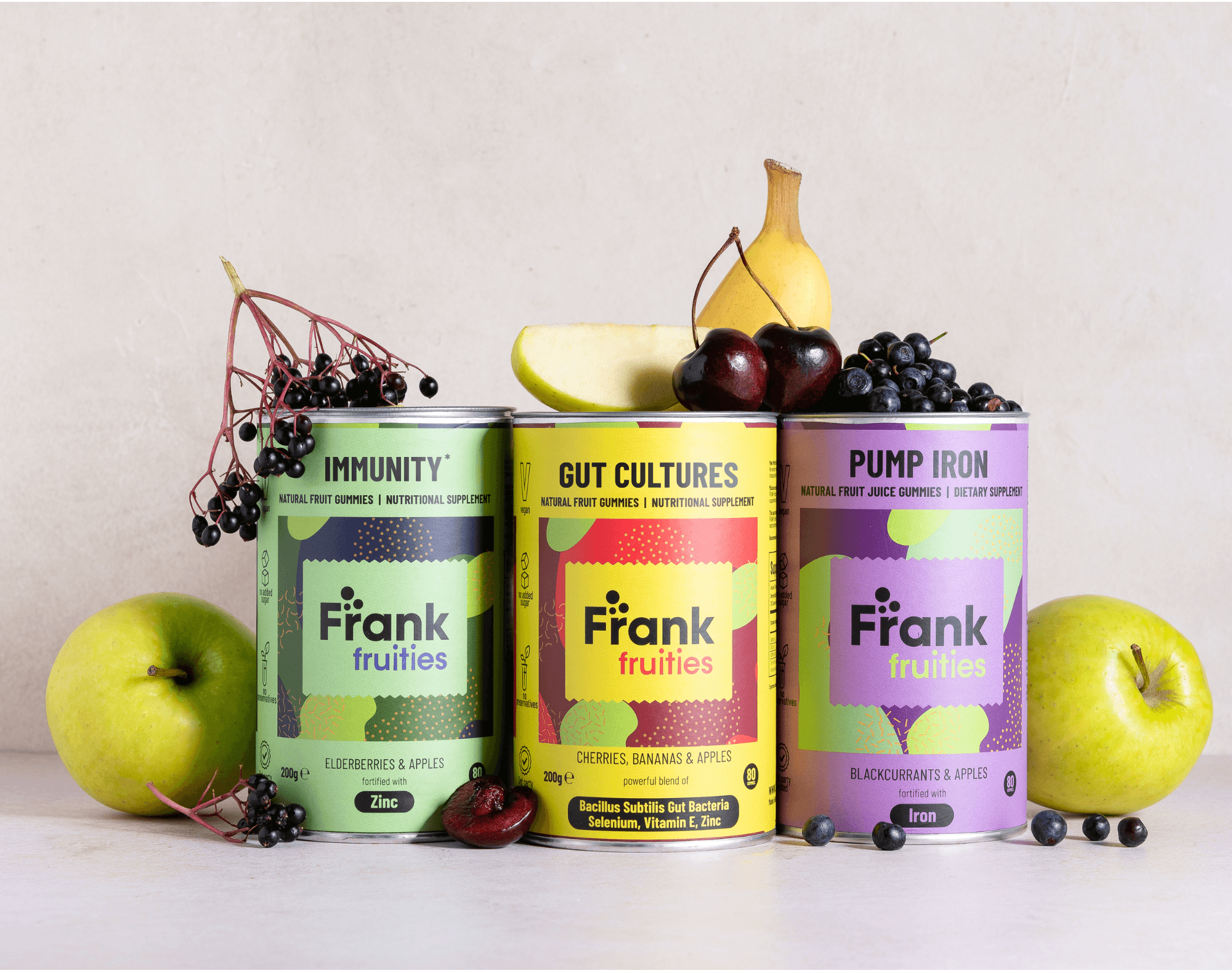 FRANK Fruities – Tugev immuunsus komplekt sisaldab: 1 x GUT CULTURES, 1 x PUMP IRON ja 1x IMMUNITY puuviljakomme.