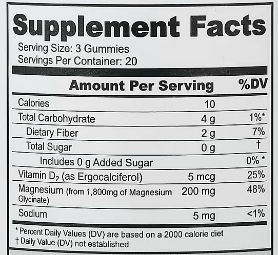 Koostis: magneesiumglütsinaat, ergokaltsiferool, lahustuv tapiokikiud, alluloos, vesi, pektiin, looduslikud maitsed, sidrunhape, naatriumtsitraat, õunhape, puu- ja köögiviljamahl (värv), stevia ekstrakt.